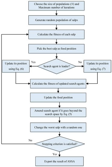 In addition, in the suggested ASSA, at each iterative process, the worst salp with the highest objective function value is replaced with a completely random salp. The flowchart of the proposed ASSA is shown in Figure 1.