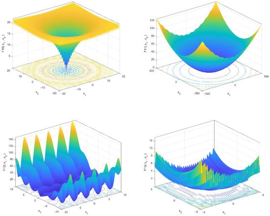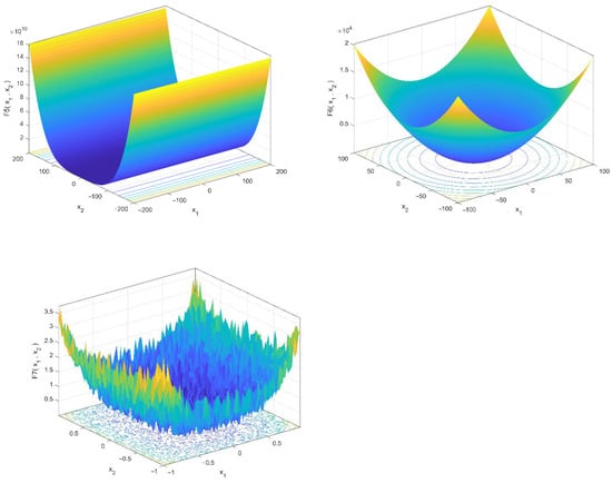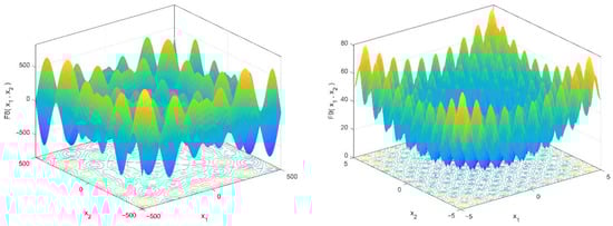 The mathematical models and characteristics of these test functions are shown in Table 2 and Table 3. This standard set was divided into two categories: (1) unimodal functions with a single global best for testing the algorithm convergence pace and enslavement ability and (2) multimodal functions with multiple local minimums and a global ideal for testing an algorithm’s local optima avoidance and exploratory capacity. MATLAB R2020b was used to create the suggested algorithms. All these functions should be minimized. Furthermore, all the functions had dimensions of 30. Three-dimensional drawings of these benchmark functions are illustrated in Figure 2 and Figure 3.