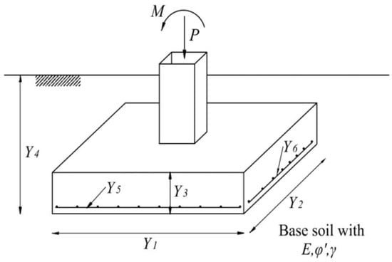 Figure 4 depicts the design features for the given model. The design variables were divided into two categories: those that described geometric dimensions and those that described steel reinforcement. As shown in Figure 4, there were four spatial design variables that reflected the foundation dimensions: the foundation’s length (Y1), the width (Y2), the thickness (Y3), and the embedment’s depth (Y4). The steel reinforcement also had two design variables: the longitudinal reinforcement (Y5) and the transverse reinforcement (Y6).