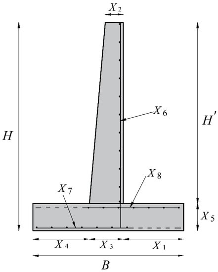 In Equation (8), Cc, Ce, Cb, Cf, and Cs are the unit costs of concrete, excavation, backfill, formwork, and reinforcement, respectively. The unit costs considered here are listed in Table 7 [].