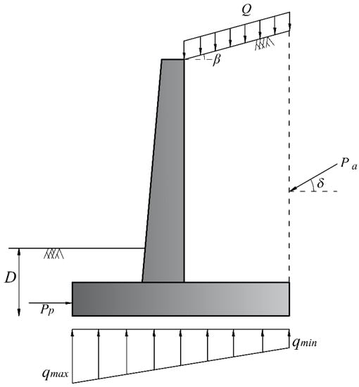 The most common geo-structures in practical application are reinforced concrete retaining walls and spread footings, which have received considerable attention in recent studies [,]. These structures are commonly used and typically involve a large volume of material. In the past, the initial anticipated dimensions of retaining structures were tested for stability and other building code requirements. If the dimensions were insufficient to meet the constraints, they were adjusted until all the requirements were met. During this time-consuming, iterative process, the cost of construction was not taken into account. In the optimum design of these structures, the dimensions that provide the lowest cost and weight of construction while meeting all the design requirements are automatically determined.