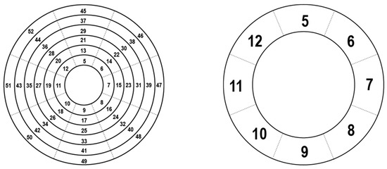 Antenna clusters are made up of the outer centric rings of antenna beams that surround the core and they are made up of 8 antenna beams, all scanning successively one after the other. The cluster’s area of operation increases with each cluster, and as the circular area of coverage grows after each antenna is finished. Due to the large number of antennas, the sectors tend to have higher reliability and outrange the core. The mathematical operations required to work on the clusters are identical to the operations needed by the core. The structure of all the antenna cores is shown in Figure 2, where shows the examples of antenna clusters on the left side of the image, and a single isolated core is shown on the right side.