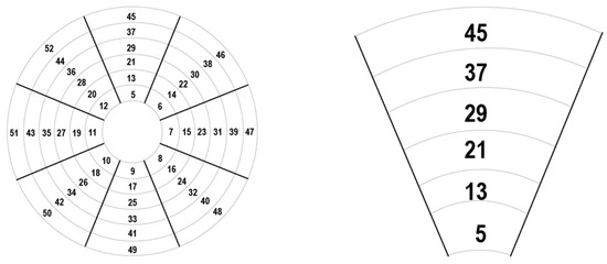 The antenna sectors protrude linearly outward from the core and are adept at measuring the distance from the core. They are composed of antenna beams that are protruding outwards from the core and are displaced in a line. They are made up of columns of antenna beams. Through the pattern in Figure 3, the entire sectors in our target area and a single isolated sector are shown. The mathematical calculation remains the same as for the central core and antenna cluster, with the only variations being in the number of antenna beams used by each single sector. The sectors of all antennas and a single antenna are shown in Figure 3.