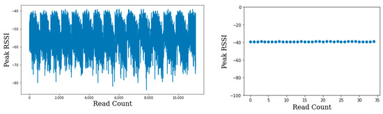 In Figure 5, the two diagrams show how we can parse the received RSSI values in order to accommodate and allow for steadier and linear results; by choosing either the floor or the ceiling threshold, we can obtain fewer conflicting data. During the calculation, we deferred to the ceiling values as they showed the highest possible RSSI per RFID tag. In an ideal situation, lower RSSI values would arise from tags at a further distance. However, in the practical test, as a result of the complex environmental factors and multipath effect, the RSSI value from the device could not directly reflect the distance between the tag and the antenna [16]. Some RSSIs of reference tags and tags to be tested can be grouped into theoretical values and measured values according to different formulas [18]. The results can be logged to allow for further study, such as for deep learning models of estimation. The main idea behind position estimation via mapping techniques is to determine a regression scheme based on a set of reference tags’ data, and then to estimate the position of a given node according to this regression function [19]. Whilst the results are pseudo-periodic, there is visible randomness. Due to the great interference brought by complex indoor channel environments to the wireless signal propagation, the RSSI value of tags appears to undergo random fluctuations [20].