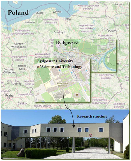 - Kaliskiego, S. Projekt budowlano-wykonawczy. Budynek audytoryjny kompleksu obiektów ATR w Fordonie; Biuro Projektowo-Badawcze Budownictwa Ogólnego Miastoprojekt-Bydgoszcz: Bydgoszcz, Poland, 1999. (In Polish) [Google Scholar]