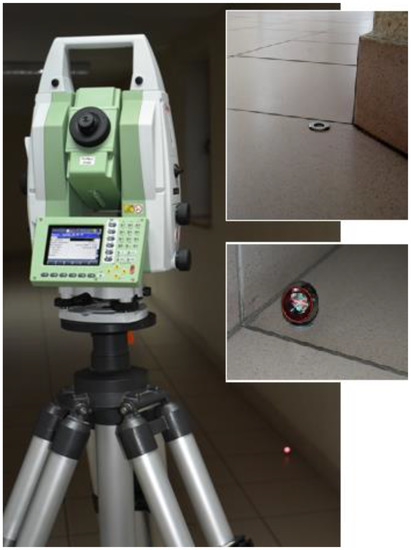 The displacement of the controlled points network was measured with the TDRA6000 laser station (Figure 2). The station is equipped with direct drive technology, which allows obtaining the accuracy of 3D point measurement at the level of 0.25 mm and allows for the observation of horizontal and vertical directions with an average error of 0.0013 g and a distance of 0.2 mm [58,59]. Due to the possible measurement accuracy, the device with appropriate software is an excellent tool for monitoring the condition of engineering structures.