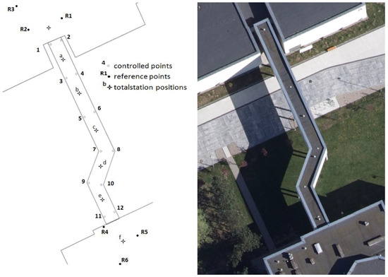 The control points and reference points have been marked inside the passage and on the structure of neighboring buildings in the form of pads glued to the floor (Figure 2). The diagram of the location of the measurement and control network points on the monitored object is presented in Figure 3.