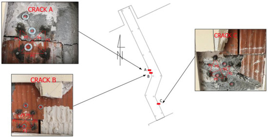 At the same time, displacements were also tested with a crackmeter. The SHM-X crackmeter is a simple tool for measuring changes in crack and expansion joint widths. Four pins (measurement points) are installed at the measuring point, allowing for precise crack control. In expert measurement, displacements in two directions (perpendicular and parallel to the crack) are determined, and a crack or dilatation separates the angle of rotation between the parts of the structure. For a complete analysis, five measurements P1–P5 of the distance between the selected pins are required [63]. A diagram of the location of measuring points A, B, and C is shown in Figure 4.