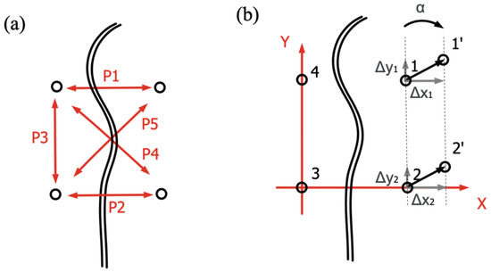 The SHM crackmeter measurement method (own study based on [64]): (a) complete analysis measurement, (b) coordinates calculating method.
