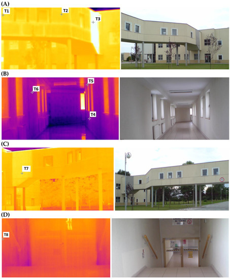 The temperature was read from the infrared images using the FLIR TOOLS software. Below is a detailed summary of the structure thermic observed for each measurement series (Table 2). Points T1, T2, T3, and T7 are on the external walls, while points T4, T5, T6, and T8 are on the internal walls. The location of the points for which the temperature was read is shown in Figure 6.