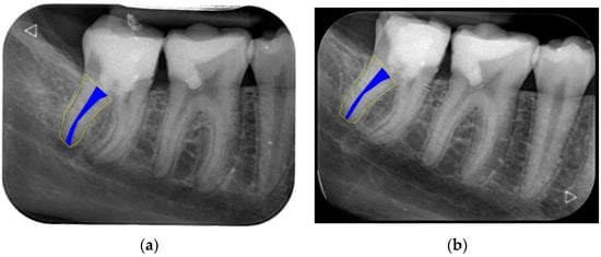 We clinically assessed the outcomes in the absence of any signs and symptoms and a negative cold-sensitivity test. Periapical healing, root elongation, RRA, and apical closure were assessed radiographically (Figure 1a,b). For this, we re-sized the immediate postoperative and follow-up periapical radiographs to match the size and pixels. We used the Freeware Image J software (version 1.47; National Institutes of Health, Bethesda, Rockville, MD, USA) together with the TurboReg plugin tool (Philippe Thevenaz, Biomedical Imaging Group, Swiss Federal Institute of Technology Lausanne, Lausanne, Switzerland) Rasband 1997–2018 [] as described by Kahler et al. []. In brief, for radiographs obtained using different imaging systems, we used the ‘Images to Stack’ and ‘Stack to Images’ functions to equalise the number of pixels in the radiograph. Subsequently, the radiographs of each case were aligned and normalised using the TurboReg plugin tool. This tool enabled the measurement of curved roots (Figure 2a,b). Two evaluators (RY and AYK) conducted the calibration sessions using instructional videos. All cases were separately reviewed by two calibrated examiners. They discussed the case upon obtaining dissimilar results until it was resolved. The above-mentioned changes in root dimension were calculated as a percentage (Figure 3a,b). Hence, we evaluated the effect of the treatment based on the relative increase in RRA and root length.