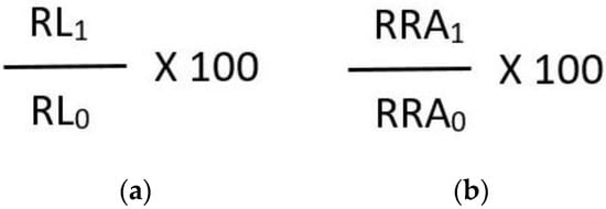 The formulae used to calculate relative measurements (%) of the radiographic length (a) and root area (b).