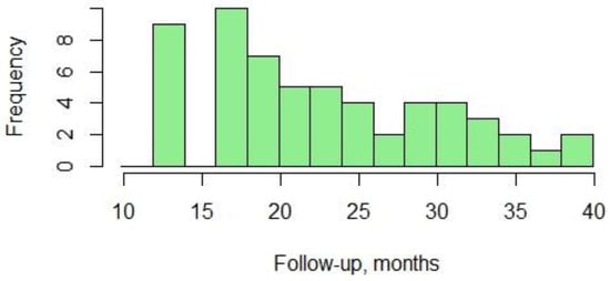 The REP protocol was based on recommendations by the American Association of Endodontists [] and the European Society of Endodontology []. During the first REP appointment, teeth were anaesthetised using 2% lidocaine with 1:100,000 epinephrine (Safco, MI, USA), and a rubber dam was placed for isolation. We measured the radiographic root length and performed copious irrigation with 4% NaOCl (Fertilizers and Chemicals, Haifa, Israel) with minimal instrumentation. The teeth were dressed for 14–28 days using an antibiotic paste, containing equal parts (250 mg each) of metronidazole (Sanofi-Aventis, Paris, France), cefuroxime axetil (Zinnat; GSK, Brentford, UK), and ciprofloxacin (Dexcel, Or-Akiva, Israel) dissolved in saline using Centrix (Accudose 24GA Needletubes Shelton, CT, USA). We instructed the patients to contact the clinic in case of a flare-up or swelling. During the final appointment (21–30 days later), the teeth were accessed under rubber dam isolation, following anaesthesia with 3% Scandonest (Septodont. Rue du Pont de Creteil 94107 Saint-Maur-des-Fosses Cedex, France) without a vasoconstrictor. The intracanal dressing was rinsed using 20 mL of 17% ethylenediamine tetraacetic acid (EDTA) using an Irrisafe irrigation tip (Satelec, Acteon, Phoenix Park Eaton Socon, A1, St Neots, Wyboston, Saint, UK) or XP-endo Finisher (FKG Dentaire, Switzerland). A qualified nurse drew 49 mL of blood from the median cubital vein using a butterfly needle (BC12; Zhejiang Kindly Medical Devices Co., Longwan, China). The blood sample was immediately centrifuged for 8 min at 1300 rpm according to the manufacturer’s instructions [] to prepare PRF at the chair side. PRF was extracted using forceps, sectioned into small pieces, and stored in sterile conditions at room temperature until use. Prior to PRF introduction, a precursor # 20 K-file was overextended 2 mm apically to induce bleeding. Freshly prepared PRF was condensed to the full root canal length using an entire set of B&L pluggers (Biotech, VA, USA). Subsequently, a collagen plug (Collagen Matrix, NJ, USA) was placed over the PRF, 1 mm below the cemento-enamel junction. The teeth were restored using bioceramic materials, namely mineral trioxide aggregate (MTA; Angelus, Londrina, Brazil) in the posterior teeth and Biodentine (Septodont, Saint-Maur-des-Fosses, France) in the anterior teeth. This variation was practiced owing to the lesser discoloration by Biodentine than that by MTA []. The access cavity was sealed using a glass ionomer (Fuji, Tokyo, Japan) in the anterior teeth and using a glass ionomer with a composite filling above it (FilteK P60, 3M Centre, St. Paul, MI, USA) in the posterior teeth. The follow-up period ranged between 12 and 38 months.