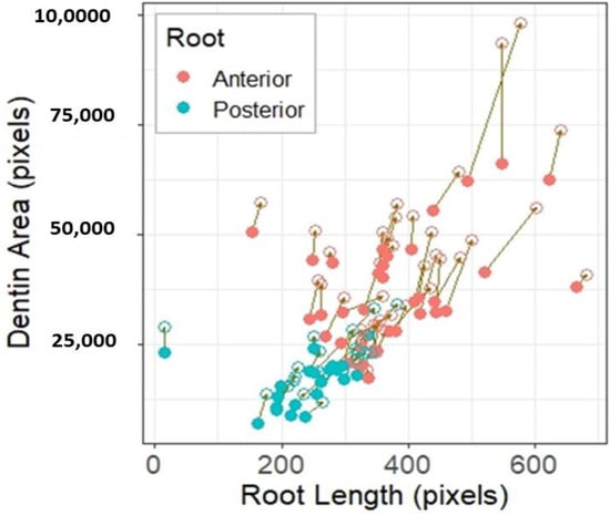 Summary statistics were computed and presented for the clinical outcomes in the cohort. We calculated the Pearson correlation coefficients and p-values of the correlation test to assess the correlation between the relative increases in root length and dentin area. The distributions were characterised using boxplots (25% quantile, median, and 75% quantile). We assessed the statistical significance of differences between the mean increases in the dentine area or root length in the anterior versus posterior roots using the t-test with unequal variance (Welch t-test). Furthermore, we determined the association between the root closure status and anterior/posterior root location using the chi-square test. We evaluated the significance of the association between the relative increases in the dentine area or root length with root closure status groups (closed/incomplete/unchanged) using the one-way analysis of variance. All analyses were performed using R software, version 3.6 (https://www.r-project.org/ (accessed on 1 September 2021)).