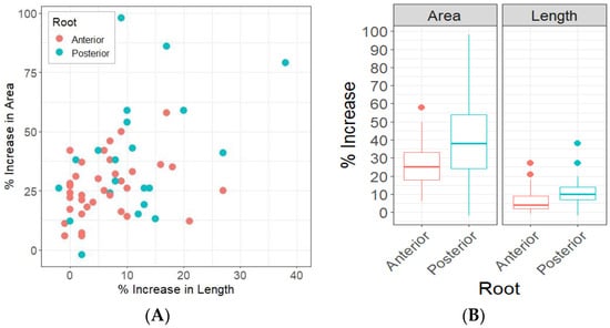 The relative increase (in percentages) in root length and RRA (radiographic root area). (A) scatterplot of increase in area vs increase in length; (B) individual distributions shown as boxplots. Coral and blue circles represent anterior and posterior roots, respectively.