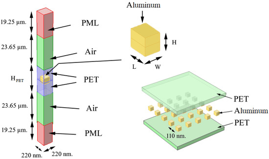 In Figure 1, the illumination of VIS starts from the upper perfectly matched layer (PML), traveling through the air layer down to the film, with an input power of 1 watt. Aluminum nanocubes are surrounded by PET and enclosed by an air layer. The air layer is sealed on the top and bottom with a PML boundary condition for absorbing all the reflected waves, assuming that the top and bottom regions of the film are infinite in extent [45]. The PML layers have a height of 19.25 µm. All the domains are meshed by tetrahedral meshes with a maximum size of no more than 0.1 times the shortest VIS wavelength (or in this case 0.1 × 400 nm). In our study, the largest mesh size is no more than 40 nm.