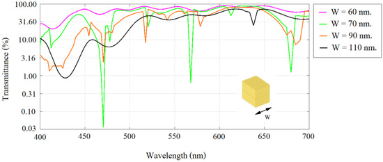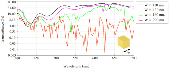 Transmittance when W is varied from 110 to 200 nm.