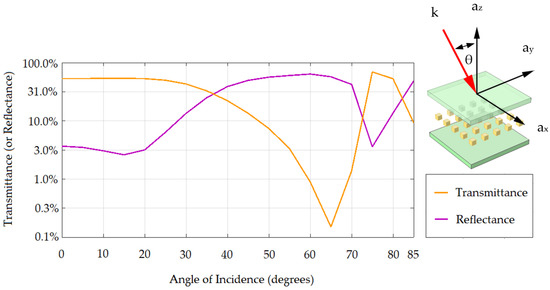 The incident light may not always strike the film’s surface at a normal incidence in actual use; therefore, we simulate how the light incidence at an oblique angle with respect to the film’s x-axis affects the transmittance and the reflectance, as in Figure 9. From the simulation, the film still works well. The transmittance does not vary much when the incident angle is between 0 and 30 degrees. In the range of 60–70 degrees, the color of the proposed film changes from blue to yellow without the need to reverse the film, because it falls in the critical angle regime. This phenomenon is a characteristic that is specific to our film and is not available in other security techniques.
