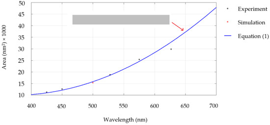 Equation (1) is derived from Schade et al.’s experiment, which showed that particles of different sizes had different resonant frequencies. In our case, the horizontal area is W × L = 110 nm × 140 nm = 15,400 nm2 and the resonant wavelength is 500 nm. Such findings show good consistency when plotted against Equation (1), shown as the red dot in Figure 10. However, Schade et al.’s prototype was not immediately suitable for security film, as their nanoparticle size was not the optimum dimension. Nevertheless, the optimum values of W and H can be obtained from our studies.