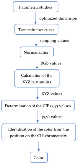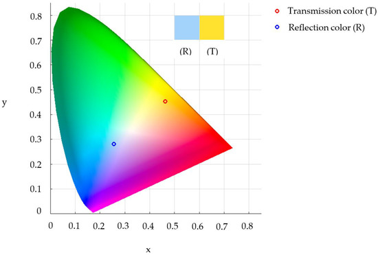 The next study is to transform the transmittance to color, in accordance with the Commission International d’Eclairage: CIE standard, which defines three primary colors standardized at the wavelengths of 700 nm (red), 546.1 nm (green), and 435.8 nm (blue), respectively [49]. The CIE chromaticity diagram is a diagram that shows all the colors that humans can perceive. It helps to pinpoint the location of color that is seen by the human eye.