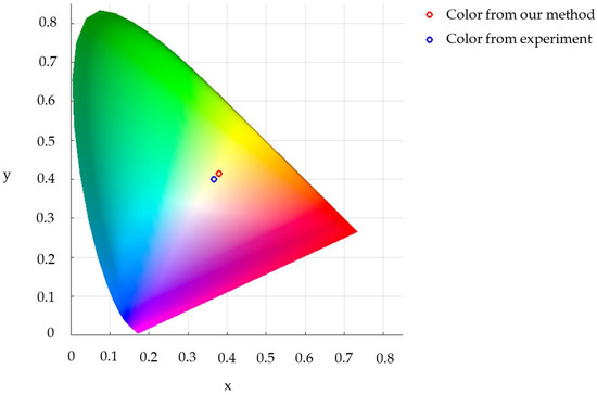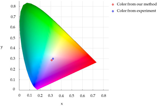 This section confirms the accuracy of the proposed color analysis method by comparing with the experimental results. In 2020, Kuroiwa et al. [38] created a security film with nanoparticles coated on top by shooting a laser onto them. The particle size was changed to the desired size by adjusting the laser intensity, which resulted in different colored particles. In Kuroiwa’s experiments, the nanoparticles were similar in size to ours. Therefore, it is appropriate to compare our results with those of Kuroiwa et al.’s. The transmittance and the color of the nanoparticles are measured by using an ultraviolet−visible-near-infrared. Our analysis begins by implementing the measured transmittance, following the steps in Figure 11. The results are summarized in Table 2. The experimental colors by Kuroiwa et al. [38], compared to our results on the CIE chromaticity diagram, are shown in Figure 13 and Figure 14. Since the true colors seen by the human eye are not those derived from RGB values, but rather those derived from CIE (x,y) values, we present a comparative analysis of color error that is obtained from the proposed color analysis method with the experimental colors from the CIE chromaticity diagram in Table 3.