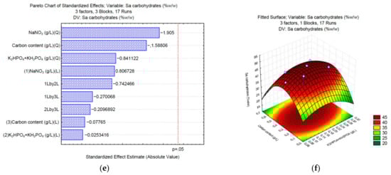 According to the Pareto chart (Figure 1a), when sodium carbonate (Sc) is used as a carbon source, the carbohydrate synthesis is significantly affected by all three factors of the C/N/P ratio (p = 0.05). The surface response (Figure 1b) shows that high concentrations of NaNO3 (0.15–0.25 g/L) and high concentrations of the carbon source (2.64–4.41 g/L of Na2CO3) positively affect the synthesis of carbohydrates up to 50% w/w of the total biomass. In the case when sodium bicarbonate (Sb) is employed, the phosphate buffer and the carbon source significantly affect the synthesis of carbohydrates (Figure 1c). The surface response (Figure 1d) shows that high concentrations of K2HPO4 and KH2PO4 (0.075 and 0.175 g/L, respectively), and high concentrations of the carbon source (2.1–3.49 g/L of NaHCO3) positively affect the synthesis of carbohydrates up to 60% (w/w) of the total biomass. Finally, the Pareto chart of sodium acetate (Sa) (Figure 1e) shows that none of the analyzed nutrients in the designated concentrations significantly affects (p = 0.05) the synthesis of carbohydrates; however, the surface response (Figure 1f) shows that high concentrations of K2HPO4 and KH2PO4 (0.075 and 0.175 g/L, respectively), and high concentrations of the carbon source (0.85–1.36 of C2H3NaO2) can increase the concentration of carbohydrates up to 45% (w/w) of the total biomass in Chlorella sp. UFPS019.