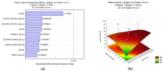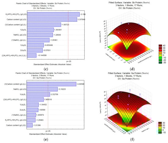 In the case of protein synthesis, when sodium carbonate (Sc) is used, the Pareto chart (Figure 2a) shows no significant effect for any of the analyzed variables; however, according to the surface response (Figure 2b), high NaNO3 (>0.25 g/L) and low concentrations of the carbon source (<1.76 g/L of Na2CO3) might increase the total content of proteins. In the case of sodium bicarbonate (Sb), the phosphate buffer and the carbon source significantly affect the synthesis of proteins (Figure 2c). The surface response (Figure 2d) shows that medium concentrations of K2HPO4 and KH2PO4 (0.0375 and 0.0875 g/L, respectively), and medium concentrations of the carbon source (1.39–3.49 g/L of NaHCO3) positively affect the synthesis of proteins up to 40% w/w of the total biomass. Finally, the Pareto chart of sodium acetate (Sa) (Figure 2e) shows that the phosphate buffer, sodium nitrate, and the interaction between NaNO3 and sodium acetate affect the synthesis of proteins. The surface response (Figure 2f) shows that high NaNO3 (>0.25 g/L) and low concentrations of the carbon source (<1.5 g/L of C2H3NaO2) might increase the total content of proteins in Desmodesmus sp UFPS021.
