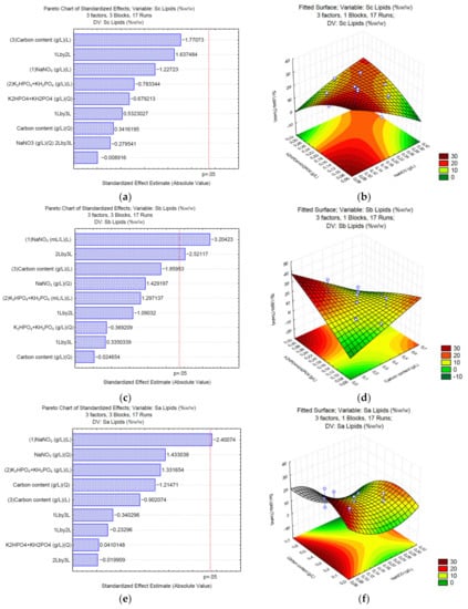 Pareto charts and surface response of lipid production using Na2CO3 (a,b), NaHCO3 (c,d), and C2H3NaO2 (e,f).