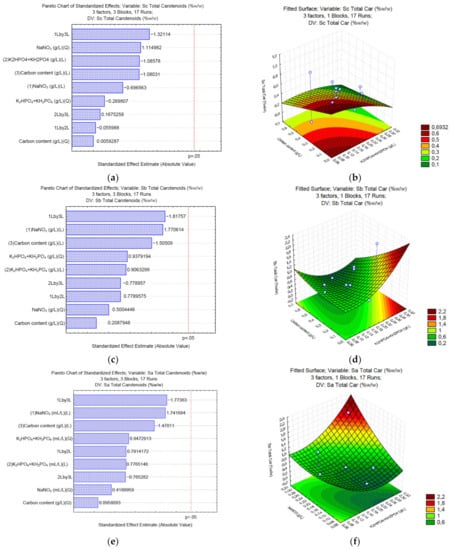 Pareto charts and surface response of total carotenoids production using Na2CO3 (a,b), NaHCO3 (c,d), and C2H3NaO2 (e,f).