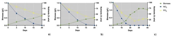Biomass production and consumption of NO3 and PO4 in the optimized C/N/P ratio for production of carbohydrates (a), proteins (b) and lipids (c).