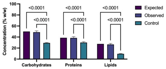 The results obtained for the different metabolites were analyzed using one-way ANOVA (Figure 6). This result shows that the concentrations of carbohydrates, proteins, and lipids under the optimized conditions were statistically significant in comparison with the results expected from the surface response and the control. The latter indicated that the proposed method effectively enhances the production of the different metabolites in the studied strains.