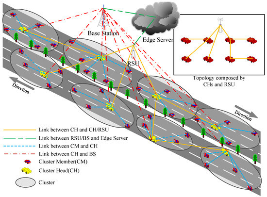 We first define some symbols to facilitate the following description. We use to denote the topological map composed of CH and RSU and use to denote the set composed of CH and RSU, where represents the CH of the cluster and CH is a vehicle entity that includes attributes, such as speed, location, packet buffer, and data generation rate. represents the set of edges in the topology graph, and represents the edge from to . is the set of clusters, where represents the cluster.