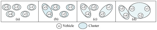 This paper uses a simple example to illustrate the clustering process of Algorithm 1. Assume that there are five vehicles traveling in the same direction on the current road segment. The velocity of is 23 and the coordinates are (1, 450); the velocity of is 20 and the coordinates are (6, 350); the velocity of is 30 and the coordinates are (3, 240); the velocity of is 21 and the coordinates are (5, 100); the velocity of is 22, and the coordinates are (2, 0). Moreover, suppose the parameters are set to: = 1, = −200, = −200, R = 4, . The clustering process is shown in Figure 3. Initialize each vehicle as a cluster to obtain , where . In the first round of the loop, , , , so merge and to . In the second round of the loop, , , , so merge and to . In the third round of the loop, , , , so merge and to . In the fifth round of the loop, , , at this time, , the clustering process is completed. The resulting clustering result is , and , .