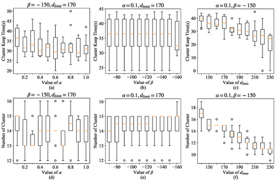 According to Equation (1), is the weight of , but is only affected by the current state of the vehicle, and the vehicle state may change at any time. Thus, reducing the influence of on can increase the stability of the cluster. With a continuous decrease in , the stability of the cluster shows an increasing trend and the outliers gradually decrease. So, the value of is 0.1. If two clusters of and at the edge of each other’s DSRC communication range are merged, the resulting cluster may be very unstable. By increasing , the value of the two clusters can be reduced, thereby limiting the merging of these two clusters. However, as shown in Figure 5b,e, when is greater than −160, the beta has less effect on cluster stability and the number of clusters. This is because the D-limit limits the maximum distance that clusters are allowed to merge, which makes it less likely that clusters at the edge of mutual DSRC communication can merge. At , the mean of the number of clusters increases, and in some cases the number of clusters starts to increase. So we take the value of BETA as −150. As shown in Figure 5e,f, has an important impact on the number and stability of clusters. The larger the is, the more distant the clusters can be merged. When is 170, a reasonable number of clusters can be obtained while maintaining good stability. At this time, the number of clusters will be reduced, and the clusters containing more CMs will be less stable. Therefore, as increases, both the stability of the cluster and the number of clusters tend to decrease. The final values of the three parameters are 0.1, −150, and 170.
