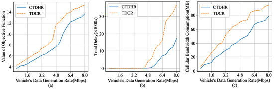 After completing the link construction, the performances of CTDHR and TDCR were compared in the test, where the data generation rate of the vehicles gradually increased from 0.4 to 8 Mbps in steps of 0.4. At each data generation rate, tests were performed in 100 different simulation environments and the test results were averaged. The duration of a single test was 1 s. Figure 6 shows the results of the objective equations, total delay, and cellular network bandwidth consumption obtained from the CTDHR and TDCR comparison experiments.