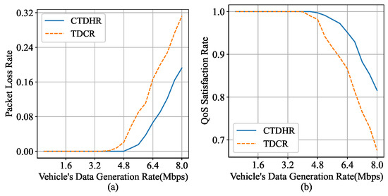 As shown in Figure 7, CTDHR has better performance in terms of both packet loss rate and QoS satisfaction rate. CTDHR can effectively address the situation in which the remaining capacity of the link is less than the data generation rate of the newly added node when generating the routing path. Therefore, CTDHR avoids the situation where traffic is concentrated on one node, which effectively relieves the pressure on each forwarding node in the topology and is less likely to cause congestion than TDCR. The final performance is that with an increase in the vehicle data generation rate, the packet loss rate of CTDHR is much smaller than that of TDCR. In addition, the CTDHR routing policy is more flexible. According to the QoS of each packet, the appropriate transmission methods are selected, which also makes CTDHR satisfy the QoS of the packet at a higher rate.