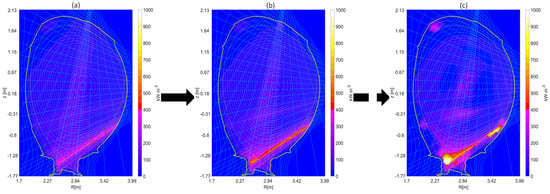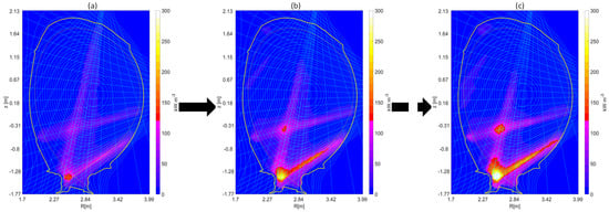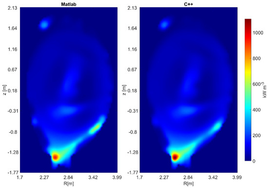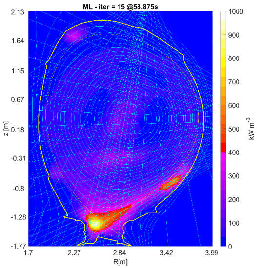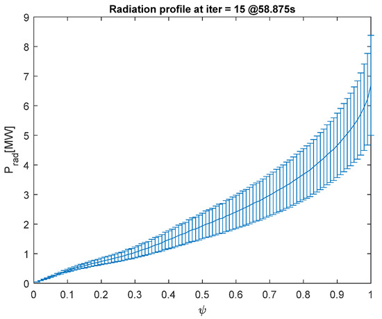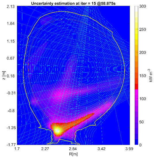 Finally, the main results are gathered and prepared to display the main information results after the number of iterations are executed. These are the final emissivity distribution (Figure 5), its associated uncertainty (Figure 6), the radiation profile (Figure 7), and the reconstructed projections, as well as the estimates of the radiated powers in a different location outside of the main chamber, such as the total radiated power, the core one, i.e., the radiated power inside the Last Closed Surface (LCFS), the one below the Xpoint position, and the radiated power in the Scrape-Off Layer (SOL).