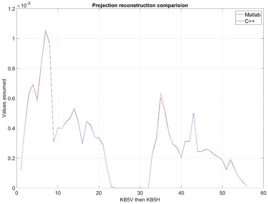 Comparison of the projection reconstruction for 15 iterations between the original MATLAB code and the C++ implementation.