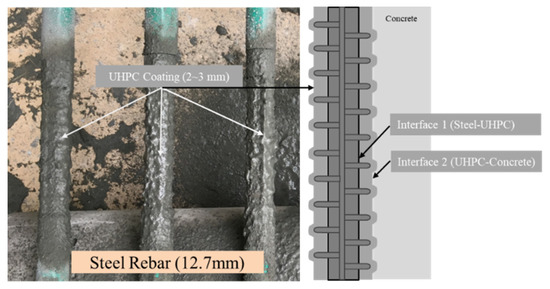 The improvement of the bond performance between reinforcing bars and the concrete matrix with a thin coating of ultra-high-performance concrete (UHPC).