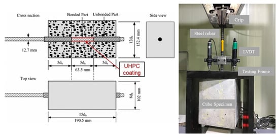 The specimen was placed on the universal testing machine (UTM) so that the surface of the cube specimen on the side of the long end of the bar was in contact with the bottom of the mold. The end of the rebar was gripped using the jaws of the testing machine, as shown in Figure 2. The pullout behaviors of the UHPC-coated steel rebar were identified using a 2000-kN-capacity universal testing machine. A rate of 0.02 mm/s was selected and a continuous pullout load was first applied to the bars until failure. The interfacial bond slip between the embedded rebar and the concrete at the loaded end was simultaneously measured using linear variable displacement transducers (LVDTs). The readings of the applied pullout load and the corresponding three LVDTs were automatically recorded through a data logger.