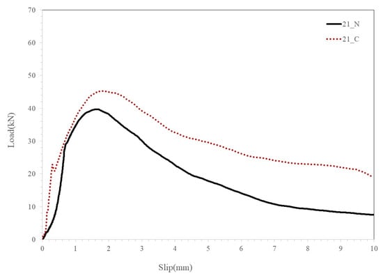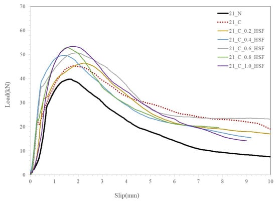 Figure 3 shows the load–slip curve for specimens 21_N containing a reinforcing bar without the UHPC coating and 21_C containing a reinforcing bar with the UHPC coating. When comparing the uncoated test specimen (21_N) with the UHPC-coated test specimen (21_C), noticeable changes (bond strength, toughness) in the coated test specimen can be confirmed. The load–slip curves of the two types of specimens were similar. A small slip change was shown in the initial loading section, and after reaching the maximum load the load gradually decreased, with the slip increasing. However, the bond strength of 21_C was 15.3% greater than that of 21_N and resulted in an increase in toughness performance. This was because the UHPC coating creates an additional interface and increases the bonding strength between the rebar and concrete, thereby delaying the progress of cracks. Figure 4 shows the load–slip curve of the uncoated rebars in concrete mixed with the PVA fiber. When the fibers were mixed, the slip resulted in the initial load section being smaller. As shown in Figure 4, the fiber increased the bond strength of the rebars, but not by much. The bond strength of specimens with 1% and 2% PVA fiber increased by about 6% and 13.1%, respectively, which were lower than the increases due to the UHPC coating.