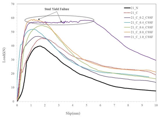 Figure 6 shows the results of the pullout test for rebar coated with UHPC after mixing CSF fibers in the concrete matrix. Similar to the case for HSF, the initial section shows a steep load increase accompanied by a small slip due to the strong bonding force at the interface. Increasing the mixing amount of fibers tends to gradually decrease the load after reaching the maximum load, while causing a steeper rise section. When the mixing ratio of CSF was 0.8% or more, the yield phenomenon of the rebar occurred in the maximum load section. It was judged that the yield phenomenon of the reinforcing bar occurred because the bonding ability at the interface was larger than that of the reinforcing bar itself []. In particular, the specimens mixed with 1% CSF showed a pullout failure phenomenon from the concrete matrix after slipping over a long section of the yield area of the reinforcing bar. Figure 7 shows the load–displacement curves of the test specimen mixed with CSSF fibers. Compared with Figure 5, the overall tendency was similar, and the yield phenomenon of the rebar was more clearly shown at 0.8% and 1.0% fiber mixing ratios due to the strong bonding force at the bonding interface. The bond strength was larger than that of the test sample containing HSF and relatively lower than that of the test sample containing CSF.