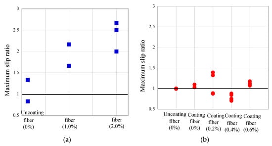 Figure 9a,b show the bond strength ratio of the uncoated rebars [] and UHPC-coated rebars, respectively. The bond strength ratio was calculated by dividing the bond strength of each specimen by the average value of the bond strength of uncoated rebar without fiber. For an accurate analysis, the bond strengths of specimens that failed after steel yielding were excluded in the comparison. Figure 9 shows that the bond strengths of uncoated rebars with 1% and 2% fibers increased by 6% and 12.7%, respectively, while those of UHPC-coated rebars with 0.2%, 0.4%, and 0.6% fibers increased by 23.4%, 32.0%, and 40.3%, respectively. The increase rate of the bond strength of the UHPC-coated rebar with a low fiber content was much higher than that of the uncoated rebar with a high fiber content. This means that the UHPC coating promotes the increase in the bond strength of the rebar. Figure 9b shows that the bond strength of the UHPC-coated rebar increases by about 15 percent compared to the uncoated rebar. Figure 10a,b show the maximum slip ratios of uncoated rebars [] and UHPC-coated rebars, respectively. The maximum slip ratio was calculated by dividing the slip of each specimen at peak load by the average value of the slip of the uncoated rebar without fiber. Contrary to the change in bond strength ratio, the increase in the slip ratio of the uncoated rebar was greater than that of the UHPC-coated rebars. The slip values of the uncoated rebars with 1% and 2% fibers more than doubled, while those of the UHPC-coated rebars with 0.2%, 0.4%, and 0.6% fibers were almost the same as for the rebar without fiber. This means that the UHPC coating increases the initial bond stiffness of rebar containing fiber, which will be described in detail in the next section.
