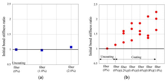 Comparison of the initial bond stiffness ratios: (a) uncoated rebars []; (b) UHPC-coated rebars.