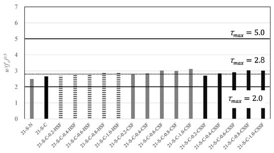 The normalized bond strength of the steel rebar embedded in ordinary concrete showed a relationship with τmax = 2.0fc′0.5 []. On the other hand, the normalized bond strength of the steel rebar embedded with UHPFRC exhibited a very high bond strength. The relationship between the bond strength and compressive strength in the study by Yoo et al. [] was suggested to be τmax = 5.0fc′0.5. In this study, a test specimen was prepared using ordinary concrete, with a thin layer of UHPC coated on the steel bar surface, and the change in bond strength was observed by mixing a certain ratio of structural steel fibers into the concrete matrix. As a result of the test, the normalized bond strength increased to about 2.8 in both the specimen simply reinforced with the UHPC coating and the specimen mixed with a certain ratio of steel fibers (Figure 12).