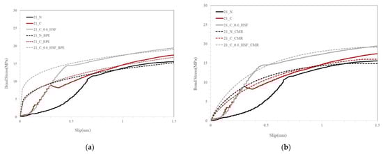 The test specimen (21-N) without the UHPC coating on the reinforcing bar’s surface showed a large slip with a gradual rising bond stress, regardless of the type of steel fiber. On the other hand, the test specimen (21-C) reinforced with UHPC between the reinforcing bar and the concrete body showed high initial stiffness due to the strong formation of bonding traction at the interface (Figure 3). In the test specimen reinforced with steel fiber, the overall initial stiffness was greater than that of the simple UHPC-coated rebar. In particular, compared to HSF, the fiber reinforcing effect was more pronounced in the test specimen containing CSF and CSSF, while the change in stiffness was also markedly improved due to the increase in the fiber mixing rate (Figure 5, Figure 6 and Figure 7). On the other hand, in a study in which a concrete matrix was made with UHPC (f′c = 200 MPa) and then the rebar pullout test was conducted, the initial stiffness was very strong with zero slippage due to the strong chemical adhesion that occurred until the maximum load was reached [,]. In this study, the changes in slippage due to the initial stiffness during the pullout process of UHPC-coated steel rebars reinforced with steel fibers were judged to be greater than that of the specimen reinforced with the UHPC body.