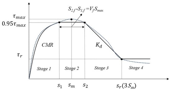 where τ and S are defined as the bond stress and the corresponding slippage, respectively; α and Kd are the parameters that can be determined from the curve fitting of the experimental results; τmax and τr are the maximum bond stress and the residual bond stress, defined as the bond stress and the corresponding slippage, respectively; S1, S2, and Sr are the corresponding slippage values for the maximum bond stress, the border of the maximum bond stress plateau, and the residual bond stress, respectively. The other model for representing the bond–slip behavior is the CMR model [], defined as:
