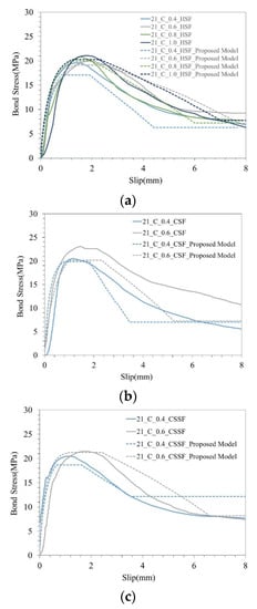 Bond behaviors between the reinforcing bar and concrete matrix generally describes three kinds of properties []. First, the chemical bond created in the interface causes adhesion resistance. Second, the frictional resistance against the slip growth in the interface is created. Third, the irregularity of the interface from the mechanical interlocking attributes to the difference in behavior of the bond–slip curve. In this study, an additional interface from the UHPC coating was created and its effect on the debonding mechanism against the bond–slip behavior was addressed by analyzing previously used bond behavior models. The BPE model [] for steel bars was developed to explain the bond–slip behavior, as shown in Figure 13: