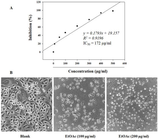 The dose-dependent inhibition of EtOAc extract on cell proliferation (A) and cell morphological change (B). (A) The cells were treated with a concentration range of EtOAc extract for 24 h, and the 50% inhibitory concentration (IC50) value was indicated by a linear regression equation. (B) The cells were treated with EtOAc extract for 24 h, and cell morphology was then visualized under an inverted microscope (10× magnification).