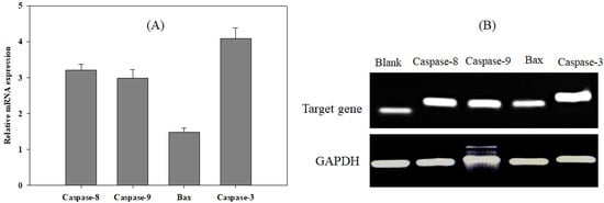 In order to clarify the inhibition of the EtOAc extract on theproliferation of gastric cancer cells, the expression level of the genes regulating the process of apoptosis was investigated. The cells were treated by EtOAC extract (50 µg/mL) for 24 h, and the expression of genes was quantified by real-time PCR. It was found that the EtOAC treatment significantly upregulated the gene expression of apoptotic signaling molecules, including caspase-3, -8, -9, and Bax (Figure 4). The gene expression levels of caspase-3, -8, -9, and Bax in the treated cells were 4.1-fold, 3.2-fold, 3.0-fold, and 1.5-fold higher than that of the untreated cells, respectively. These findings suggested that EtOAC extract may inhibit cell growth via the initiation of apoptosis in cancer cells.